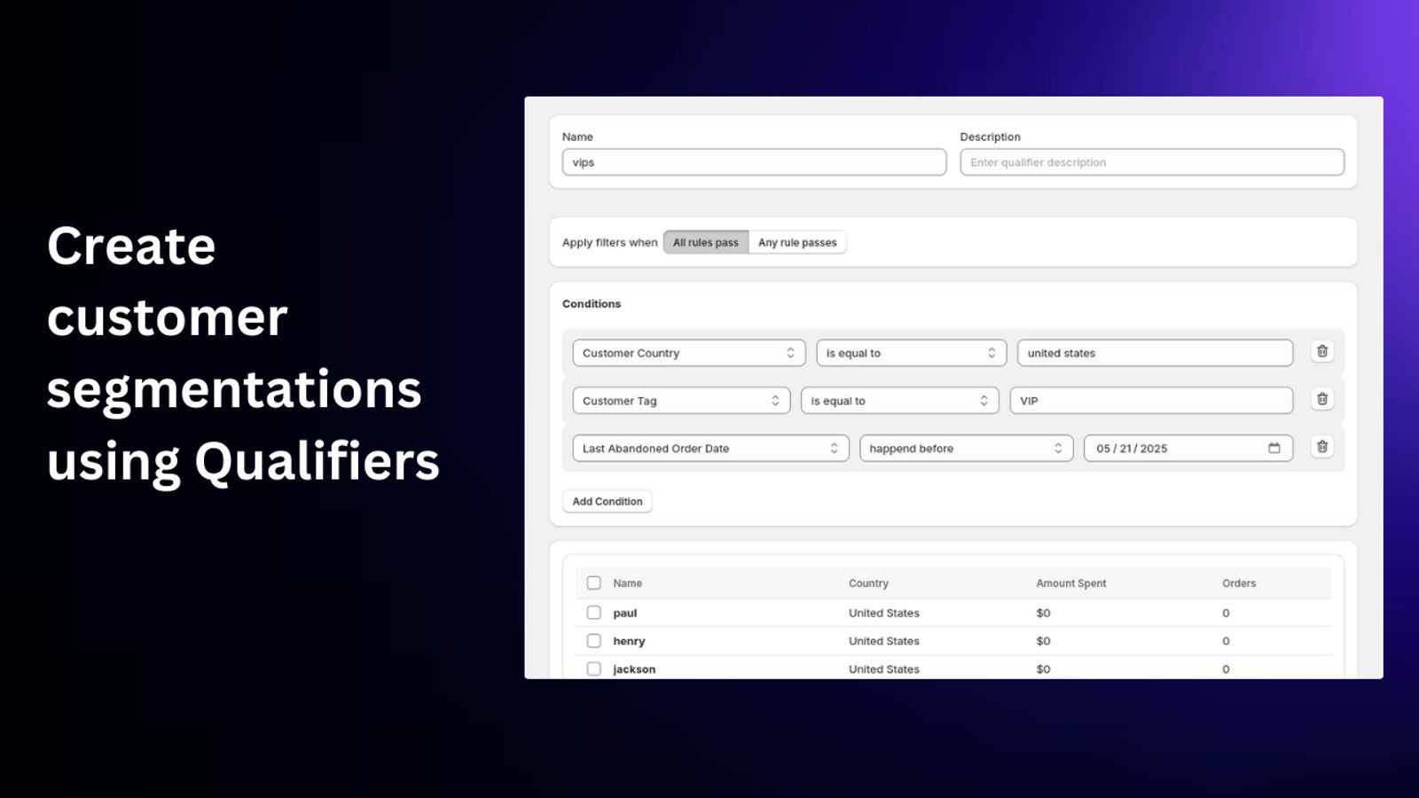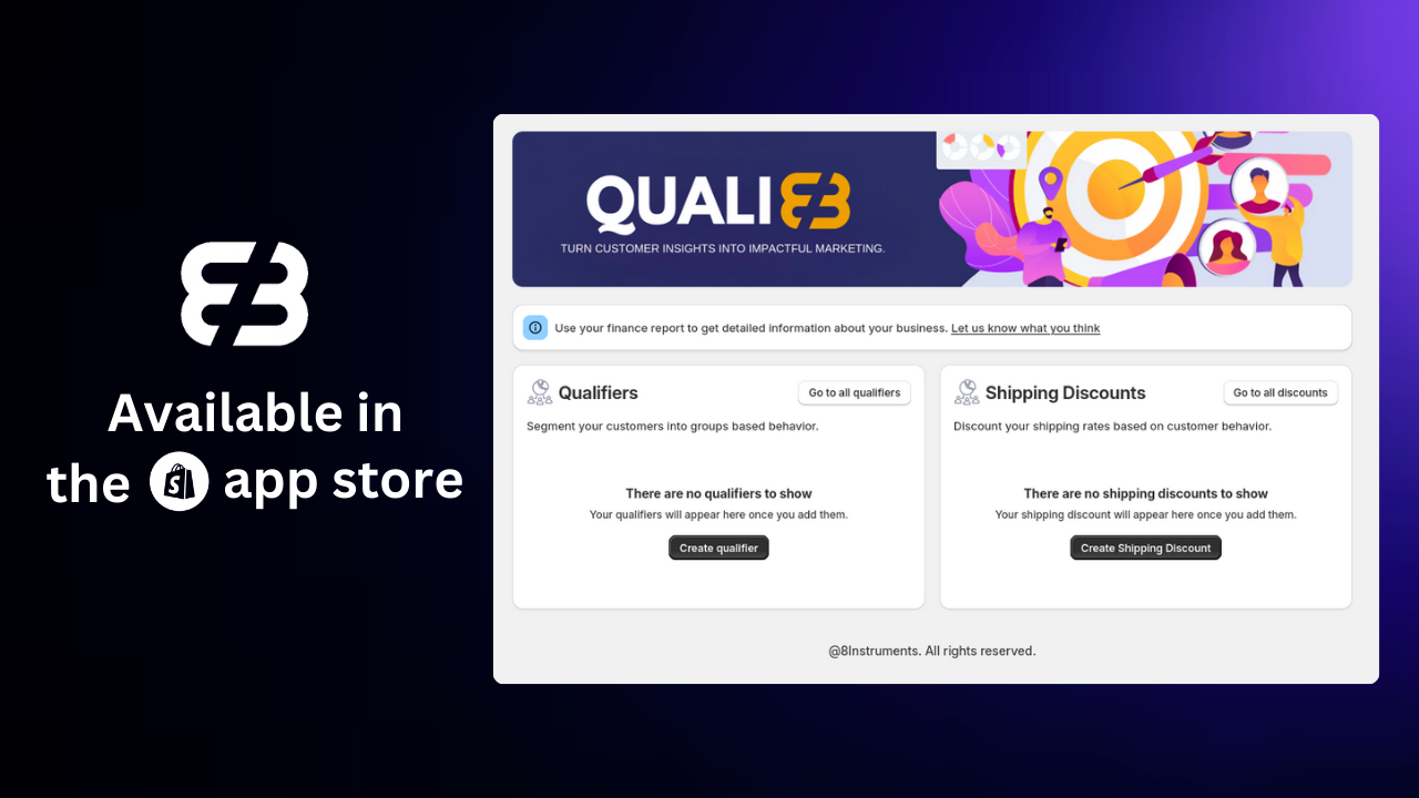 Quali8 provides you the tools to create precise customer segmentations by defining custom criteria. By using qualifiers to query your store's data, you can group customers based on behavior, demographics, and more. Once qualifiers are created, you can leverage these groups for targeted marketing actions, such as offering personalized shipping discounts.