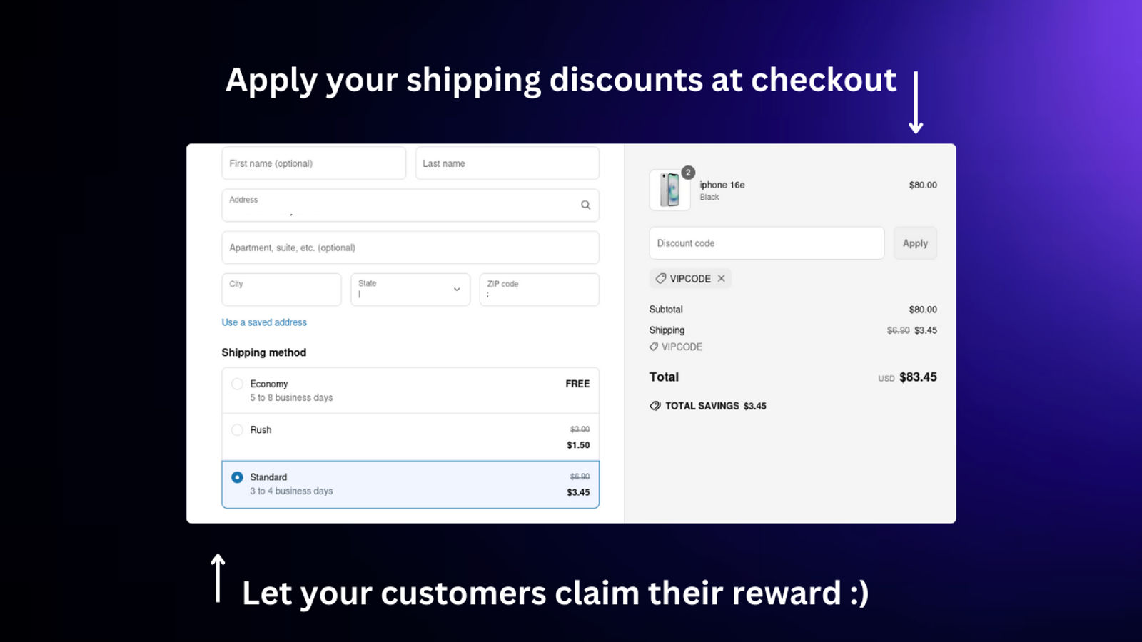 To claim your shipping discount, simply follow these steps: 1. Once customers visit your shopify checkout page. 2. Below the cart summary, you will find the field to enter your discounts. 3. Enter a valid code 4. Enjoy your savings and happy shopping!